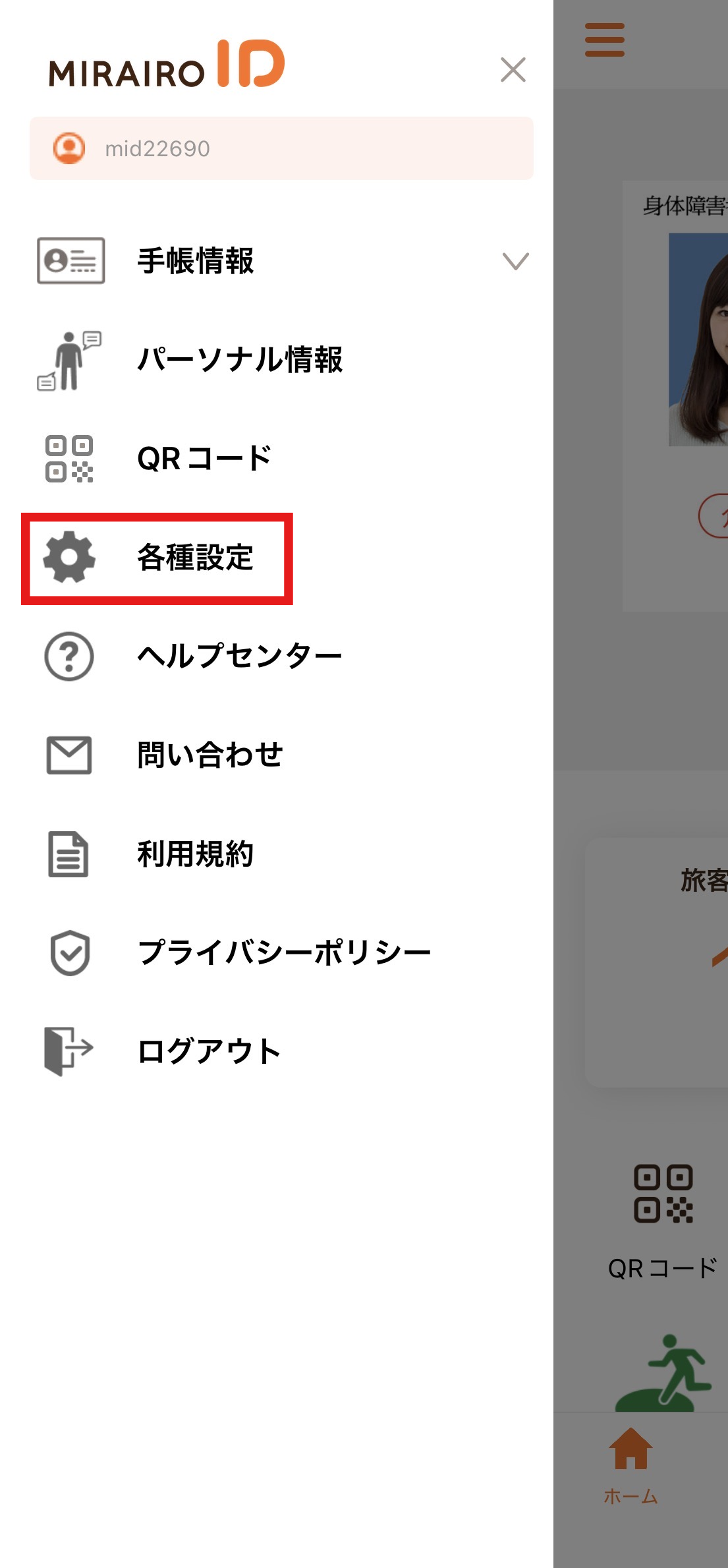 ①画面左上のメニューボタン「≡」> 各種設定 を選択します。